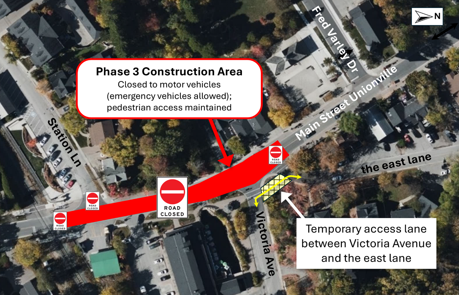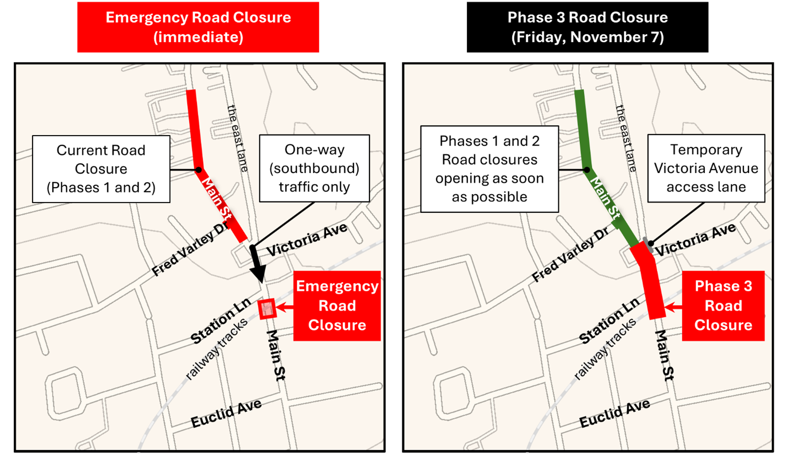 - Southbound traffic only will be permitted on Main Street (via East Lane) and exiting from Station Lane until Friday, November 7, when a temporary access lane connecting Victoria Avenue to East Lane is completed.