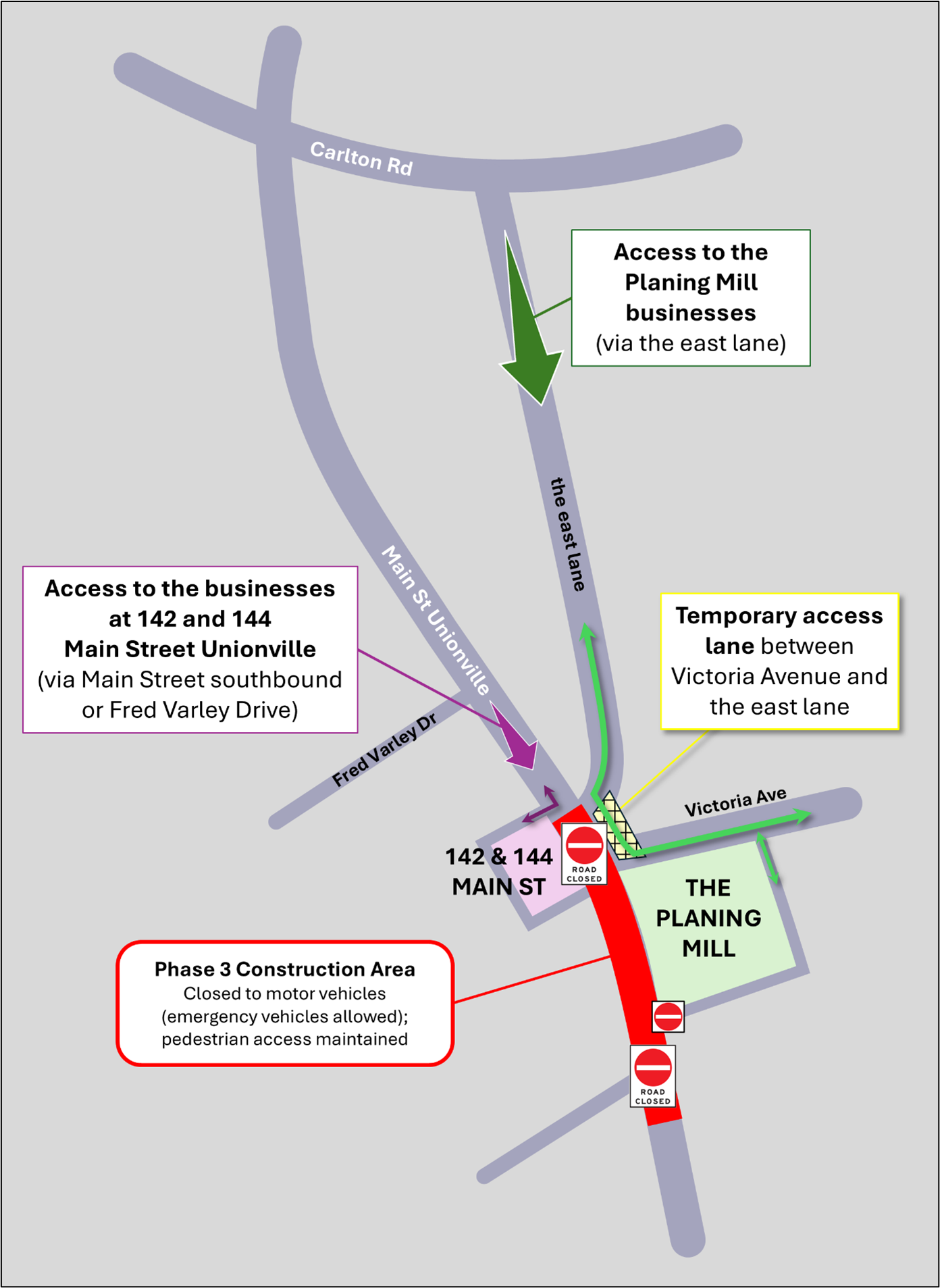 - Access to Victoria Avenue will be maintained from the east lane through the use of a temporary access lane. There will be no vehicle access to Main Street from Victoria Avenue.